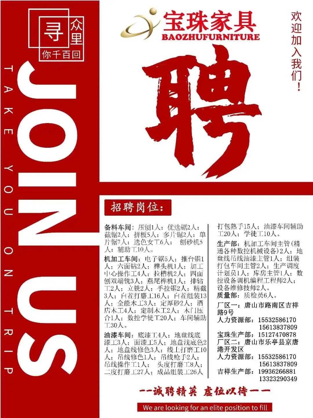 招聘岗位:备料车间、加工车间、油漆车间、生产部、质量部