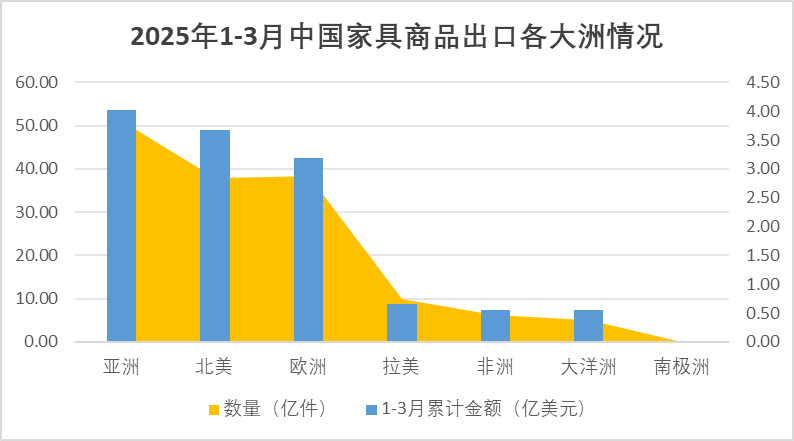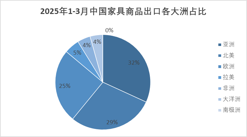 2025年1-3月,中国家具商品出口集中在亚洲、北美洲、欧洲市场,约占全部出口的86%。其中,出口亚洲市场53.71亿美元,占全部出口额(下同)的31.9%;出口北美市场49.02亿美元,占29.1%;出口欧洲市场42.48亿美元,占25.2%;出口拉美市场8.68亿美元,占5.2%;出口非洲7.46亿美元,占4.4%;出口大洋洲市场7.30亿美元,占4.3%;出口南极洲市场占比极少。
