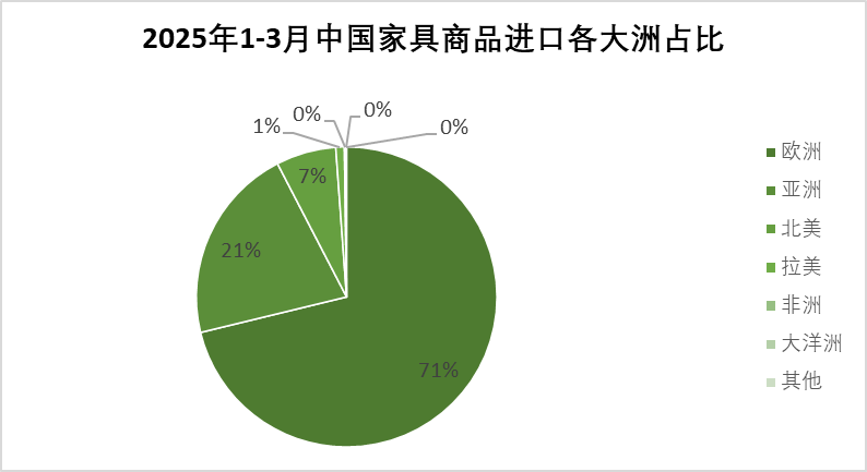 2025年1-3月,我国家具商品进口来源主要集中在欧洲,累计进口额2.51亿美元,同比下降5.3%,占全部进口额(下同)的71.2%;自亚洲累计进口额0.75亿美元,同比下降9.2%,占21.2%;自北美累计进口额0.23亿美元,同比下降6.5%,占6.5%。自拉美、非洲、大洋洲等地区进口额及占比较低,同比分别下降37.1%、67.6%、77.7%。