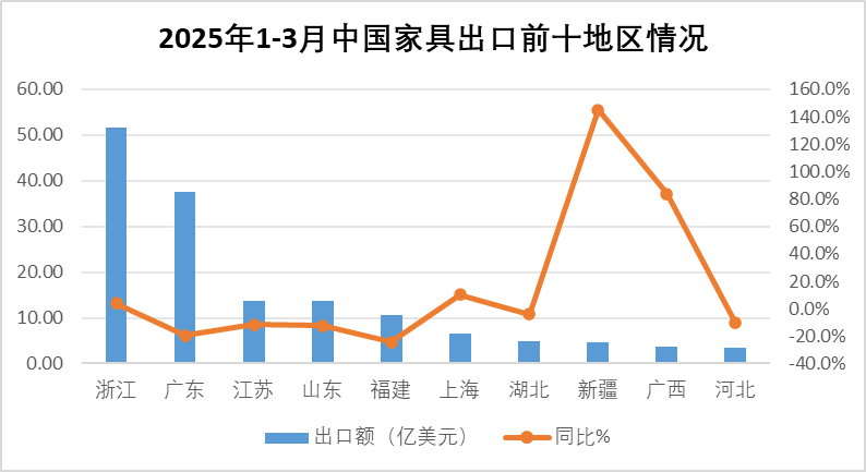 2025年1-3月,我国家具商品出口额前十的地区依次为浙江、广东、江苏、山东、福建、上海、湖北、新疆、广西、河北。其中,浙江累计出口额51.55亿美元,同比增长4.0%,约占行业总出口额(下同)的30.6%;广东累计出口额37.44亿美元,同比下降19.7%,占22.2%;江苏累计出口额13.80亿美元,同比下降11.5%,占8.2%;山东累计出口额13.79亿美元,同比下降12.3%,占8.2%;福建累计出口额10.53亿美元,同比下降24.4%,降幅居首,占6.3%;上海累计出口额6.61亿美元,同比上涨10.1%,占3.9%;湖北累计出口额4.93亿美元,同比下降3.9%,占2.9%;新疆累计出口额4.73亿美元,同比上涨145.0%,增幅居首,占2.8%;广西累计出口额3.70亿美元,同比上涨83.6%,增幅居第二,占2.2%;河北累计出口额3.44亿美元,同比下降10.3%,占2.0%。