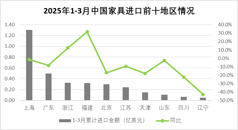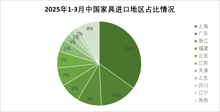 2025年1-3月,上海累计进口家具1.30亿美元,同比下降1.5%,占我国进口家具总额(下同)的34.9%;广东累计进口0.50亿美元,同比下降8.4%,占14.3%;浙江累计0.32亿美元,同比上涨12.4%,占9.4%;福建累计0.32亿美元,同比上涨31.6%,占7.6%;北京累计0.30亿美元,同比下降17.1%,占7.1%。