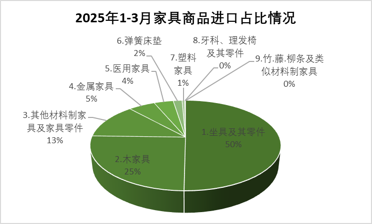 2025年1-3月,我国家具进口商品中,坐具及其零件累计进口额1.77亿美元,同比下降4.2%,占全部进口额的50.2%;木家具累计进口0.89亿美元,同比下降6.6%,占25.3%;其他材料制家具及家具零件累计进口0.45亿美元,同比下降10.8%,占12.8%;金属家具累计进口0.19亿美元,同比下降11.0%,占5.4%;医用家具累计进口0.14亿美元,同比下降14.5%,占3.9%;弹簧床垫累计进口0.06亿美元,同比下降29.0%,占1.8%;塑料家具累计进口0.02亿美元,同比下降0.3%,占0.5%;牙科、理发椅及其零件,竹、藤、柳条及类似材料制家具占比极少,同比分别下降50.2%、5.9%。