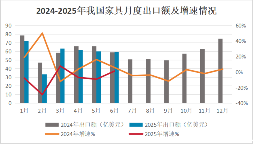 2025上半年,我国家具行业累计出口额349.15亿美元,同比下降6.72%;出口数量同比增长5.98%。一季度受春节假期及国际贸易不稳定的联动影响,出口额出现大幅波动;4-5月,受关税因素影响,出口额持续下降,分别为61.33亿美元、59.83亿美元,同比分别下降7.01%、9.18%;6月,出口增速由负转正,同比上升1.25%,为59.33亿美元,主要是关税摩擦缓和,全球制造业重回扩张区间,以及低基数等因素影响。