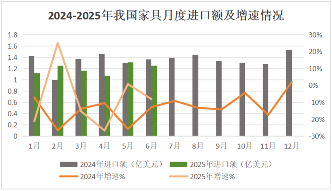 2025上半年,我国家具行业累计进口额7.16亿美元,同比下降9.48%;进口数量同比下降8.51%。一季度进口额同比下降,但2月出现今年来最大涨幅;4月进口额1.07亿美元,同比下降26.71%,是近一年来降幅最大的月份;5月进口额1.31亿美元,同比基本持平,增长0.77%;6月进口额1.25亿美元,同比下降8.09%。
