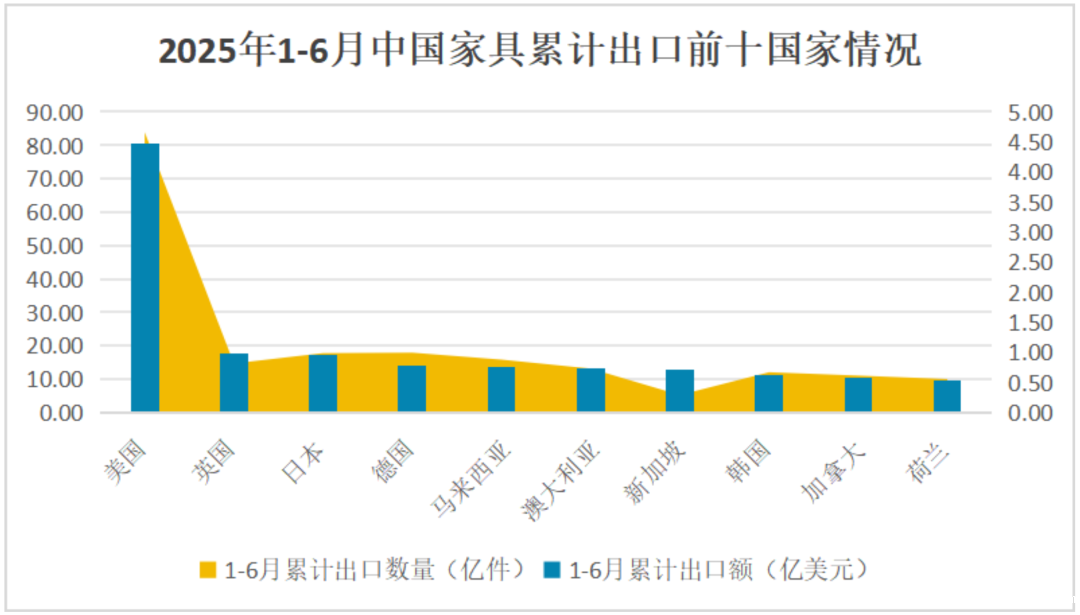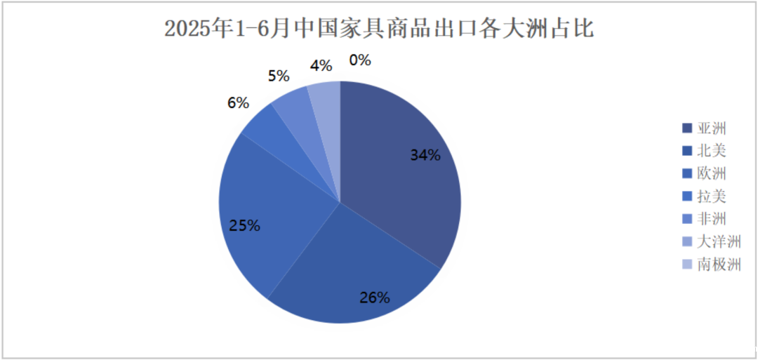 2025年1-6月,中国家具商品出口集中在亚洲、北美洲、欧洲市场,约占全部出口的84.75%。其中,出口亚洲市场119.73亿美元,占全部出口额(下同)的34.29%;出口北美市场90.80亿美元,占26.01%;出口欧洲市场85.38亿美元,占24.45%;出口拉美市场19.43亿美元,占5.57%;出口非洲18.32亿美元,占5.25%;出口大洋洲市场15.48亿美元,占4.43%。