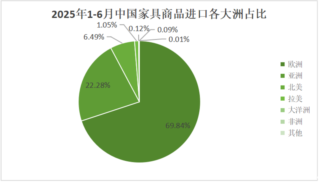 2025年1-6月,我国家具商品进口来源主要集中在欧洲,累计进口额5.00亿美元,同比下降8.28%,占全部进口额(下同)的69.84%;自亚洲累计进口额1.60亿美元,同比下降7.58%,占22.28%;自北美累计进口额0.46亿美元,同比下降19.66%,占6.49%。自拉美、大洋洲、非洲等地区进口额及占比较低,同比分别下降32.80%、71.00%、60.01%。