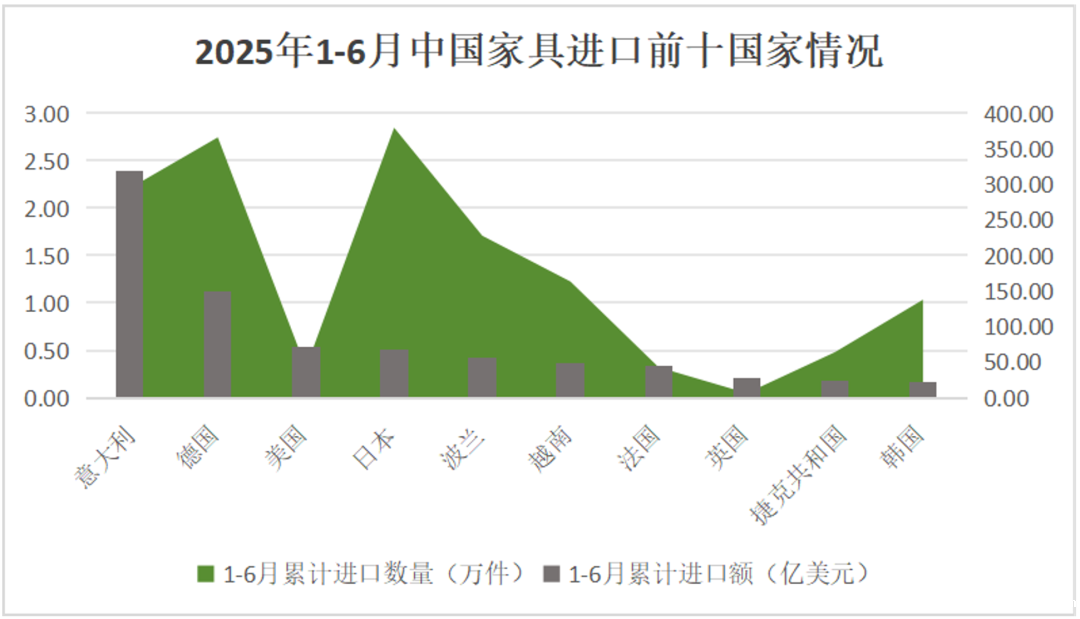 就国家来看,2025年1-6月,我国家具商品进口额居前十的来源国依次是意大利、德国、美国、日本、波兰、越南、法国、英国、捷克共和国、韩国。其中自意大利进口2.39亿美元,占中国进口家具商品总额(下同)的33.39%,远高于其他国家和地区;自德国进口1.12亿美元,占15.64%;自美国进口0.53亿美元,占7.43%;自日本进口0.5亿美元,占7.02%;自波兰进口0.42亿美元,占5.81%;自越南进口0.36亿美元,占5.00%;自法国进口0.34亿美元,占4.76%;自英国进口0.21亿美元,占2.89%;自捷克共和国进口0.18亿美元,占2.50%;自韩国进口0.16亿美元,占2.26%。