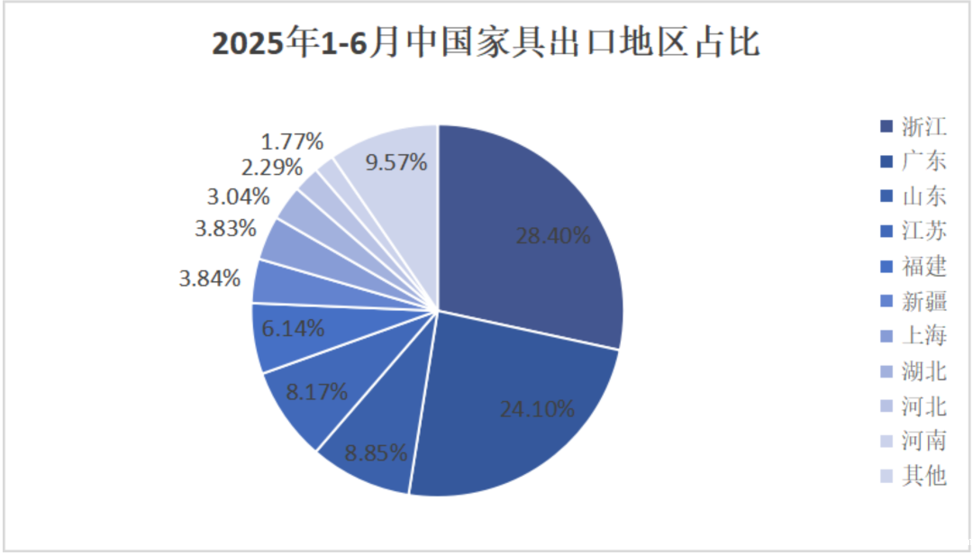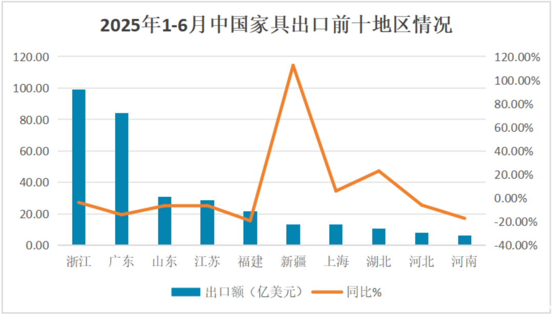 2025年1-6月,我国家具商品出口额前十的地区依次为浙江、广东、山东、江苏、福建、新疆、上海、湖北、河北、河南。其中,浙江累计出口额99.15亿美元,同比下降3.62%,约占行业总出口额(下同)的28.40%;广东累计出口额84.14亿美元,同比下降14.01%,占24.10%;山东累计出口额30.90亿美元,同比下降6.42%,占8.85%;江苏累计出口额28.53亿美元,同比下降6.30%,占8.17%;福建累计出口额21.45亿美元,同比下降19.14%,降幅居首,占6.14%;新疆累计出口额13.40亿美元,同比上涨112.57%,增幅居首,占3.84%;上海累计出口额13.38亿美元,同比上涨6.08%,占3.83%;湖北累计出口额10.62亿美元,同比增长23.05%,占3.04%;河北累计出口额8.01亿美元,同比下降5.87%,占2.29%;河南累计出口额6.17亿美元,同比下降17.08%,占1.77%。