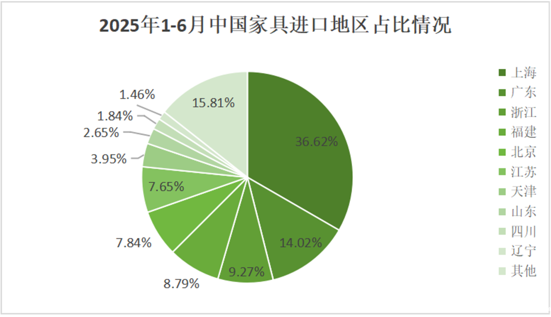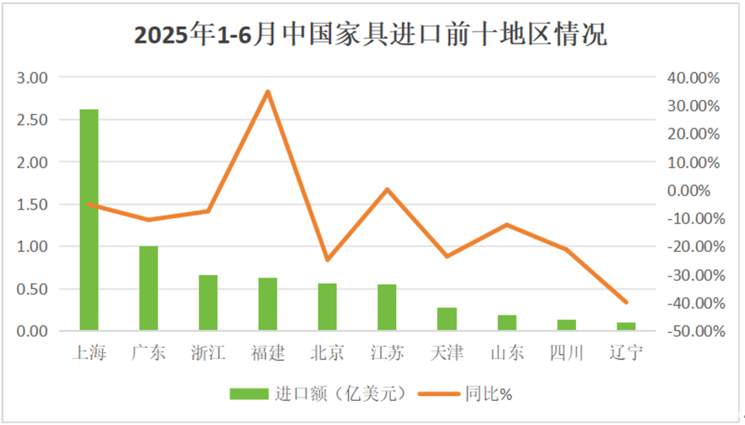 2025年1-6月,我国31个省市家具商品进口额前十的地区依次为上海、广东、浙江、福建、北京、江苏、天津、山东、四川、辽宁。其中,排名前六的地区进口总额占全部地区的84.19%。