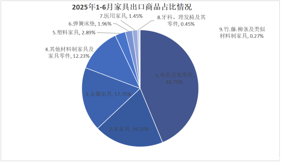 2025年1-6月,我国家具出口商品中,坐具及其零件累计出口额152.73亿美元,同比下降8.95%,占全部家具出口商品的43.75;木家具累计出口额67.22亿美元,同比下降6.80%,占比19.25%;金属家具累计出口额61.95亿美元,同比下降7.82%,占比17.75%;其他材料制家具及家具零件累计出口额42.71亿美元,同比增长4.05%,占比12.23%;塑料家具累计出口额10.08亿美元,同比下降4.02%,占比2.89%;弹簧床垫累计出口额6.84亿美元,同比增长15.91%,在家具商品类别中增幅最大,占比1.96%;医用家具累计出口额5.05亿美元,同比增长4.70%,占比1.45%;牙科、理发椅及其零件累计出口额1.59亿美元,同比下降11.87%;竹、藤、柳条及类似材料制家具累计出口额0.95亿美元,同比增长2.89%。